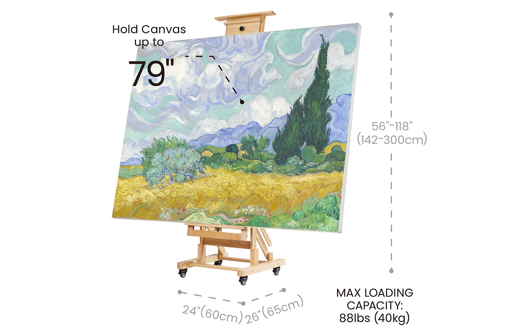 - Lyre Style Studio A-Frame Wooden Easel: This easel adjusts in height from 63" to 89" and can hold canvases up to 48". Crafted from solid beech wood with refined craftsmanship and quality steel fittings, it offers both stability and durability. The large ledge provides ample space for brushes and paints, allowing you to focus on your masterpiece and save space.