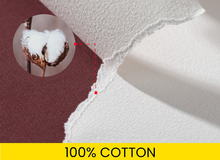 FSC-certified 100% cotton rag with pH 8.2-8.6 buffering system, exceeding ISO 9706 permanence standards.