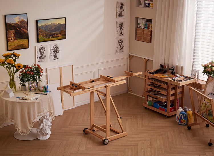 Crafted from premium European beechwood with a hand-sanded finish, this H-frame easel is built to handle your boldest visions. Whether you’re tackling a 77” mural or layering delicate watercolor washes, its rock-solid stability and silky-smooth adjustability make it a studio essential.